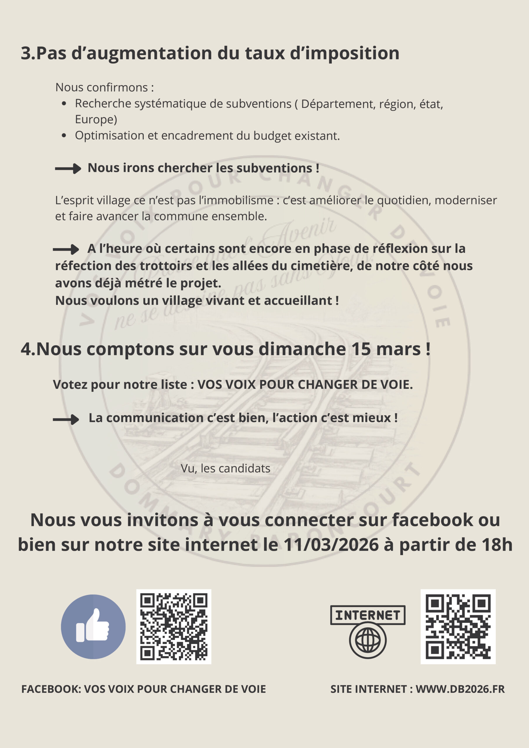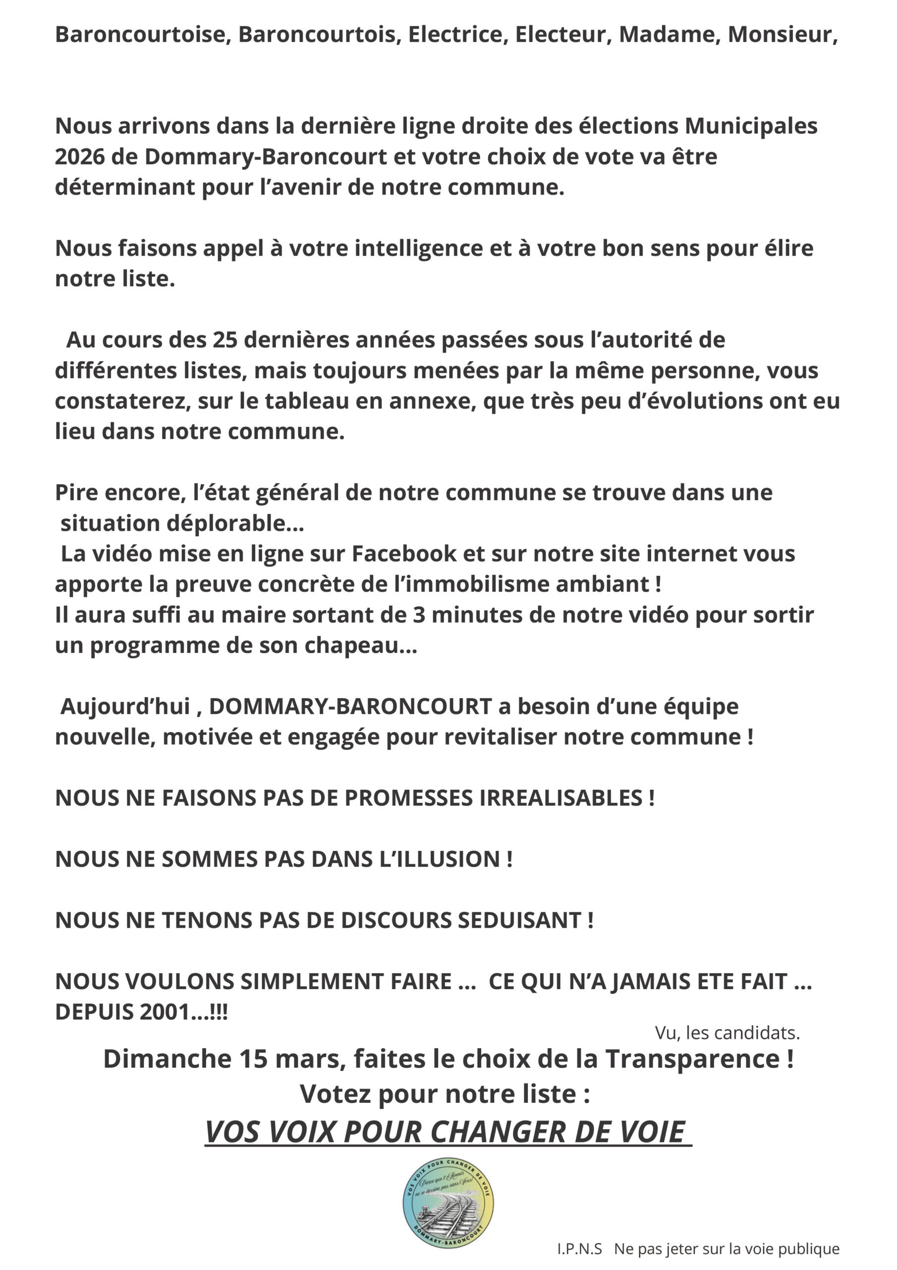 Actualités La vision quotidienne de Dommary-Baroncourt ? Affichage de notre candidature sur les panneaux électoraux réglementaires Dépot de liste réalisé et validé par la sous préfecture de Verdun Tract : Vos Voix pour changer de Voie